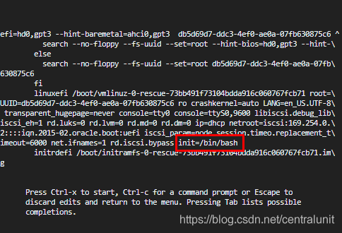 2. 在该模式中按键盘的上/下键,找到以linuxefi开头的一行,并在该行最后输入init=/bin/bash(注意前面有一个空格)