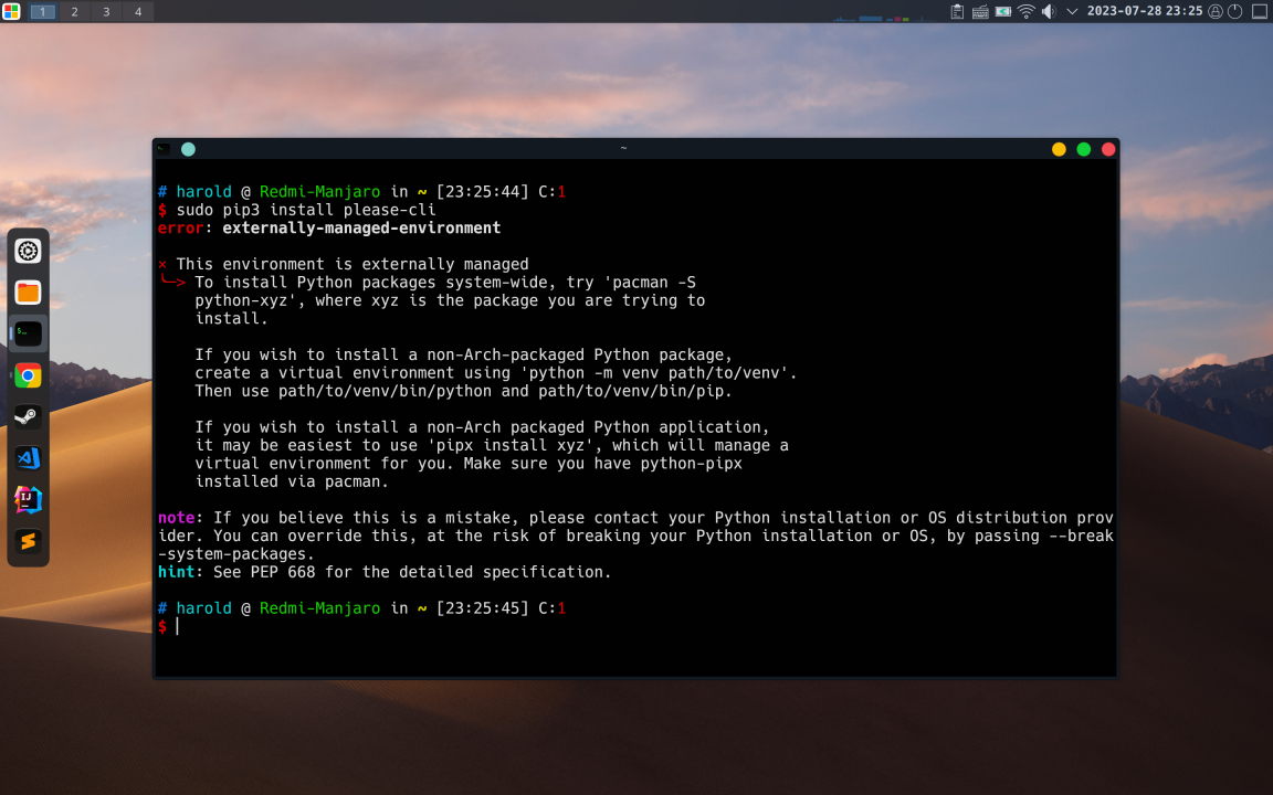 “外部管理环境”错误背后的原因:Manjaro 22、Ubuntu 23.04、Fedora 38 以及其他的最新发行版中,正在使用 Python 包来实现此增强功能。
